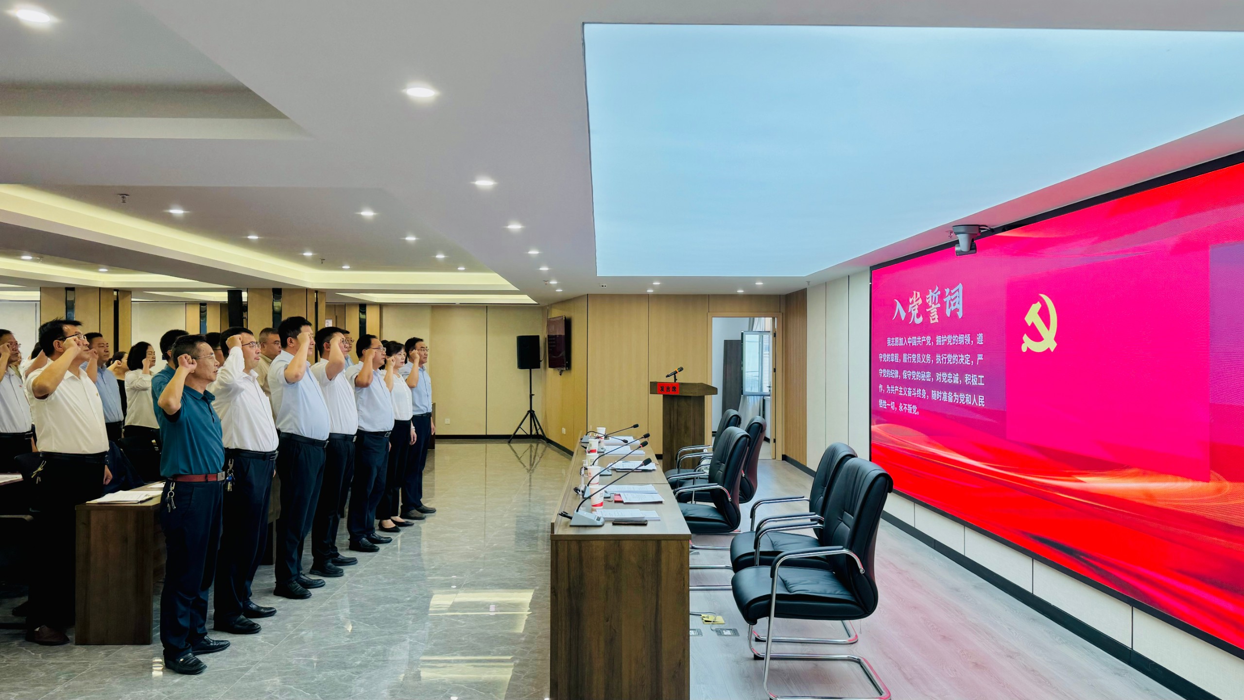 “我志愿加入中国共产党,拥护党的纲领,遵守党的章程,履行党员义务……”在集团党委委员石鹏清同志领誓下,全体党员高举右拳,重温入党誓词。铮铮誓言表达了全体党员坚定不移听党话、矢志不渝跟党走的信心和决心,时刻提醒着全体党员初心如磐、使命在肩。